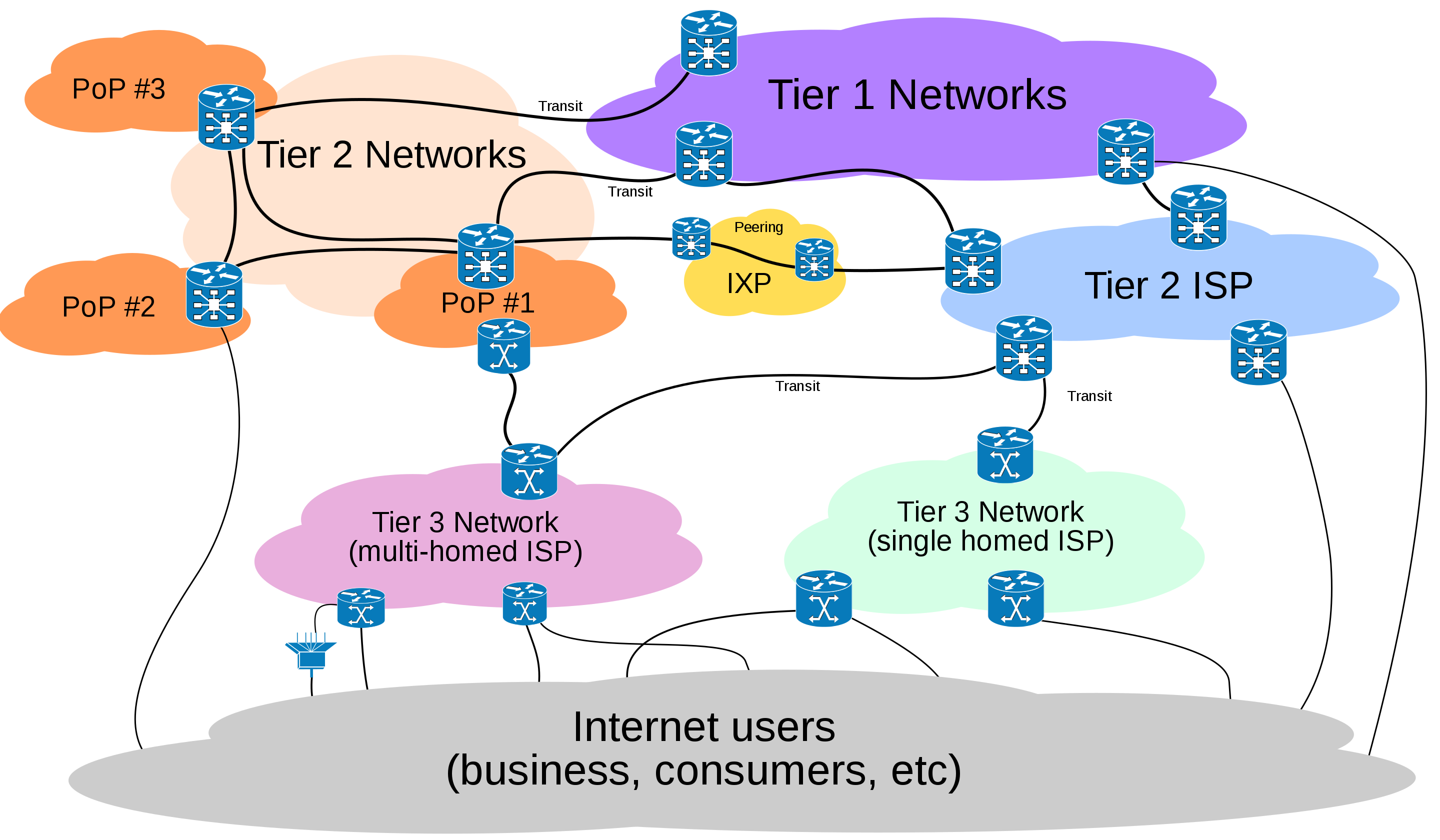 In this pyramid hierarchy, ISPs will contract with other ‘peer’ ISPs and higher Tiers (ie Tier 2 will contract with Tier 1) so as to use their equipment (end to end communication channels) to route data. These transmission agreements are typically not found easily in the public, but various agreements between these networks exist and provide guidelines on how each ISP will ‘peer’ and share resources to ensure end to end delivery of network data across the internet.